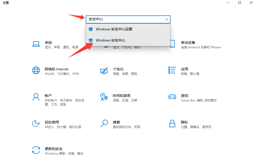 然后在搜索框内输入“安全中心”,找到Windows安全中心